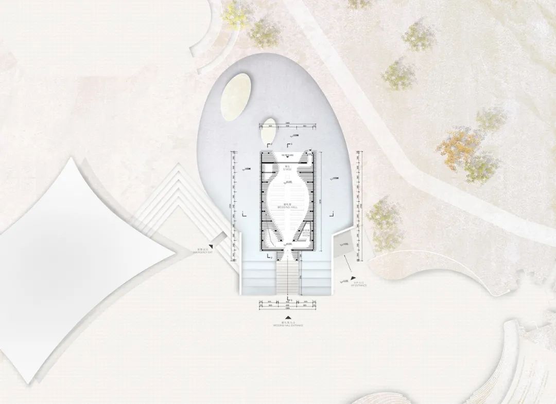 背侧景观试图打破建筑层面的硬质边界感与轴向关系,偏心的湖体轮廓,与置于其中的岛洲,亦和礼堂室内的轴线形成了偏心的对景画面。