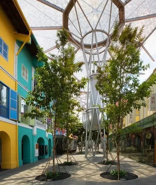 雅致的天篷设计创造了阴凉的环境,用以抵挡新加坡的高温气候,同时覆盖四条主干道和中庭。