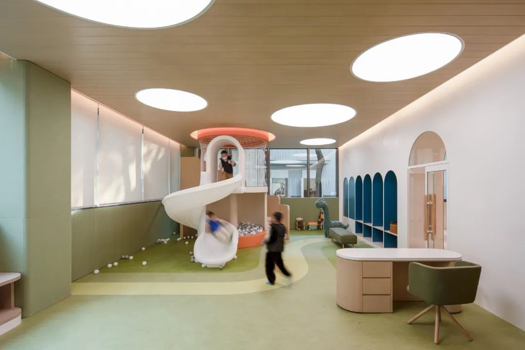 一进入口,便是开敞的欢迎式空间,为到访者的整体体验奠定了基调。一边是接待台,一边则展示着表达蔚来汽车生活方式理念的产品,例如家居、书籍、服饰和美食。再向内则是一个针对儿童的游戏休闲区,即“Joy Camp”,将家和关怀的概念带入蔚来用户的使用空间。与之毗邻的休息区则更强调出设计对生活方式的关注,希望父母在照看孩童时也可得到休憩。