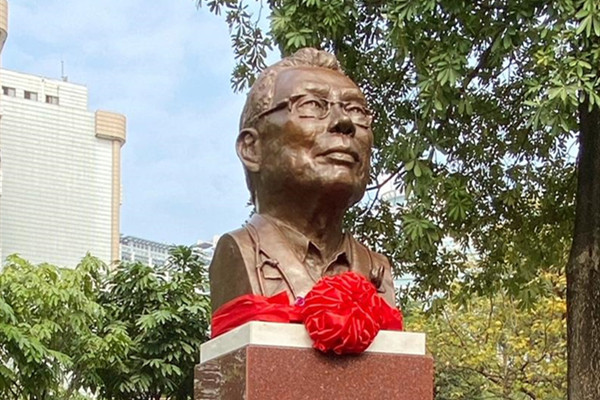 雕塑高度超两米,下半截为长方体碑身,上半截为钟南山半身胸像,钟南山院士戴着眼镜凝望远方,脖子上挂着听诊器。