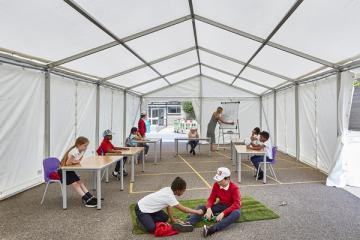 CLTH建筑事务所在伦敦建造出首个可保持社交距离的新型帐篷教室作为临时学校,以应对当下的新冠疫情。