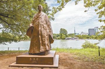 为纪念中日邦交正常化50周年,中国美术馆馆长、国际著名雕塑家吴为山的雕塑作品鉴真铜像昨天在日本东京上野公园“不忍池”湖畔落成揭幕。