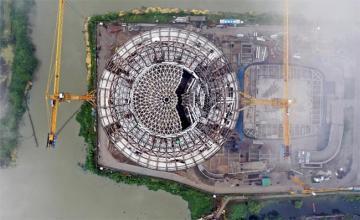 5月13日上午9点,世界最大球体建筑——浙江湖州“太阳酒店·水晶晶广场”项目1号楼顺利完成穹顶提升。