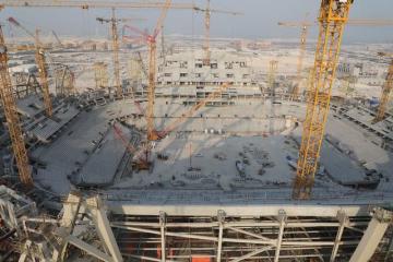 张贴着“武汉加油!中国必胜!”横幅的合龙段压环吊装升空,并迅速就位合龙,标志着中国铁建国际集团(中铁建)承建的卡塔尔2022年世界杯足球赛主体育场项目主体钢结构施工完成。