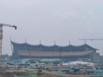 北京通州,大运河畔,城市绿心森林公园西北部,被称为“文化粮仓”的城市副中心剧院外幕墙的线条组合出一道道平滑的折线,仿佛是一整块舞台幕布正被缓缓拉起,提示观众好戏即将登台。