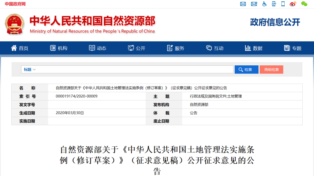 为贯彻落实党中央、国务院关于深化土地管理制度改革的决策部署,进一步健全完善以《土地管理法》为核心的土地管理法律法规体系,自然资源部起草了《中华人民共和国土地管理法实施条例(修订草案)》(征求意见稿)。为了增强立法的公开性和透明度,提高立法质量,现将征求意见稿及其说明公布,征求社会各界意见。公众可以登录自然资源部门户网站(http://www.mnr.gov.cn)查阅征求意见稿及其说明。有关意见建议可以在2020年4月30日前通过电子邮件方式发送至:fgzqyj@mail.mnr.gov.cn。