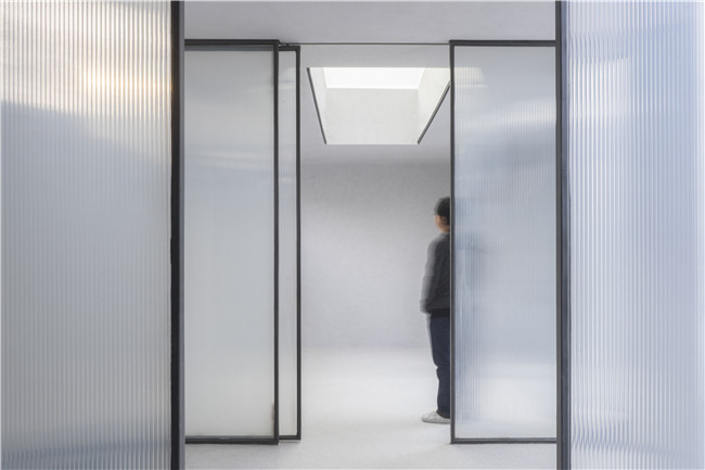 而在户外看,玻璃则将庭院镜像反射,院子的尺度感被双倍放大,真实的现代室内与倒映的山墙古树形成虚实重叠交错的场景。略带浑浊的长虹玻璃是介于虚实之间的半透材料,它的波楞构造将其背后平凡的物件和场景幻化成难以捉摸的影像,在不同光照的影响下营造出惊喜的瞬间。