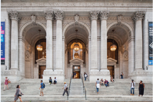 纽约公共图书馆位于第五大街和第42街交汇口的史蒂芬·A·施瓦茨曼大厦,它既是纽约市最受欢迎的标志之一,又是享誉全球的研究性图书馆,拥有数百万本珍贵的书籍、手稿,照片和其他历史遗物。